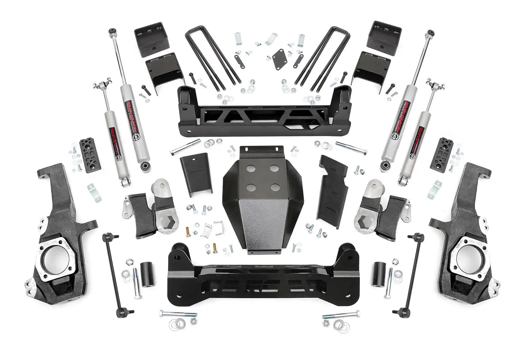 This kit also includes a set of front and rear crossmembers that are laser cut from durable US steel for a precise fit on your vehicle and feature an “RC” logo that displays prominently at the front of the vehicle. Each kit also features lifted knuckles, a beefy differential skid plate, and a set of Rough Country’s N3 Nitrogen-charged shock absorbers that provide an incredibly smooth, factory-like ride quality both on and off-road.