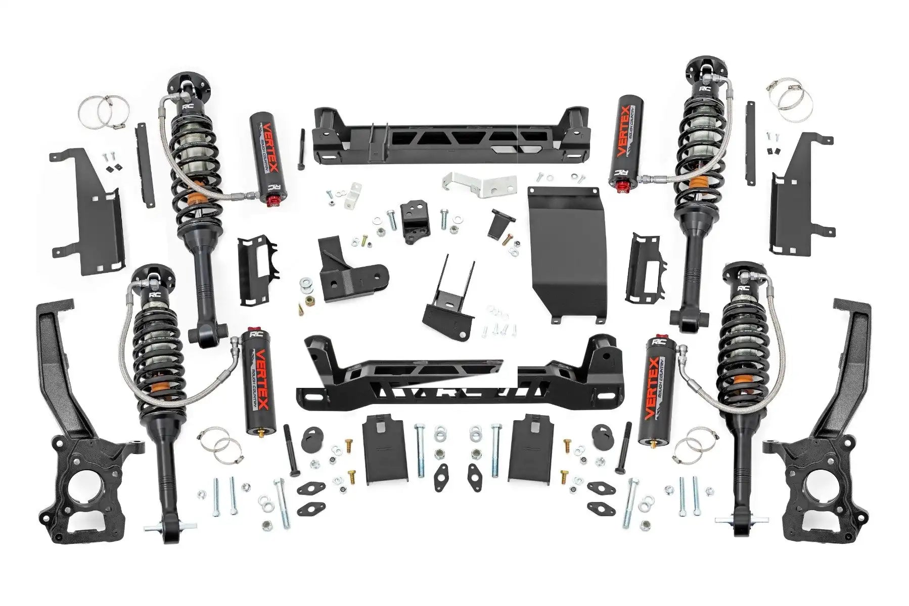 Enhanced Ride Quality and Ground Clearance. It's back and better than ever: the Ford Bronco! Your Ford Bronco from 2021 and up will have an enhanced, aggressive stance thanks to a 5-inch lift kit from Rough Country! This suspension kit includes everything required to elevate your car, giving you more space for bigger tires while removing the stock nose-down appearance for an intimidating presence.
