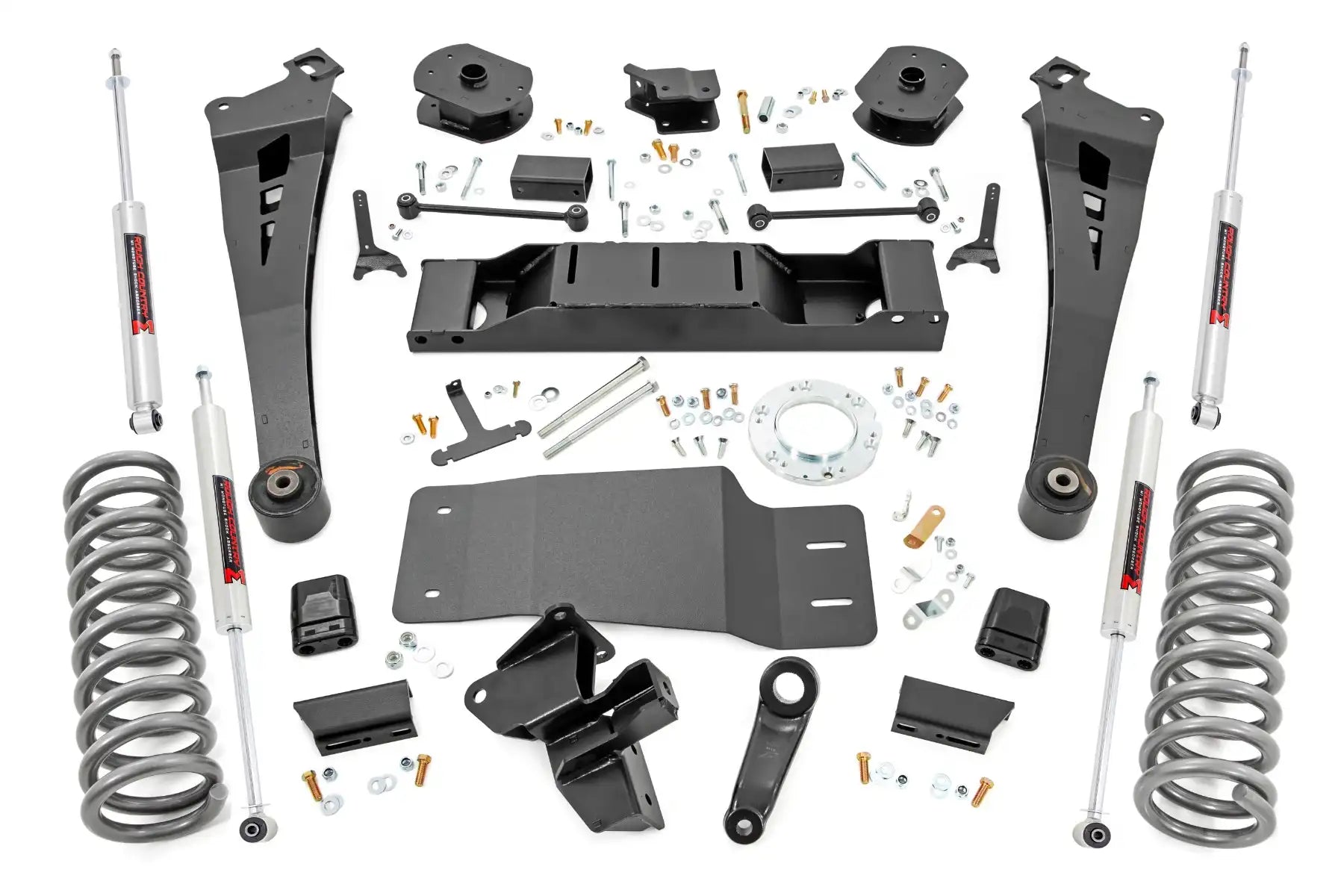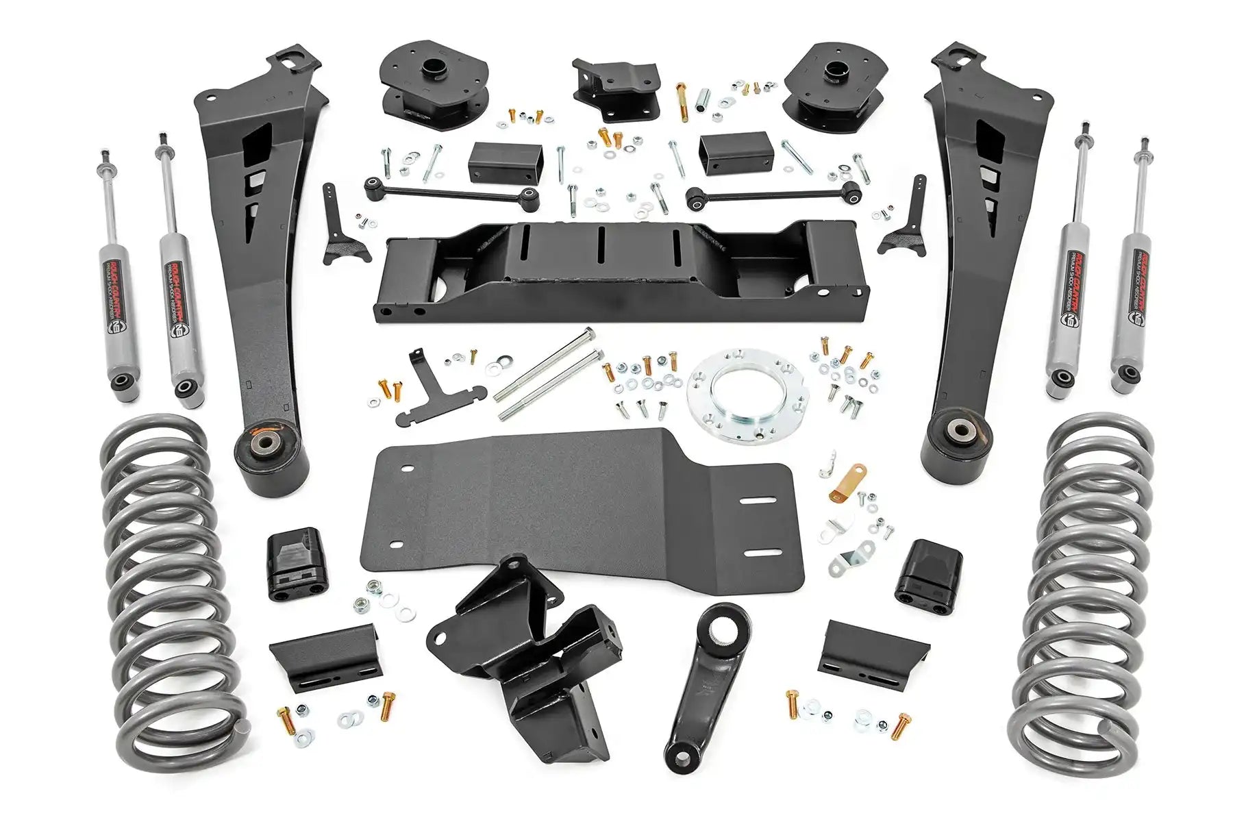 When changing a vehicle's suspension, the key to preserving ride quality is in keeping the geometry of all suspension components as close to their factory angles as possible. Rough Country's new 5-inch Suspension kit features a set of ultra-durable Radius Arms, precision fit to bolt right into the factory mounts for an easier install and a more factory-like angle. These beefy, upgraded Radius Arms also feature a durable, durable rubber bushings for maximum vibration absorption. This kit also includes a skid plate and a set of front, lifted coil springs for unparalleled ride quality from your lifted Dodge Ram. This kit also features an option upgrade for Dual Rate front and rear coils - Dual Rate coil springs combine a relatively low initial spring rate, designed to absorb minor undulations and increase grip with a secondary higher spring rate to improve handling and driveability.