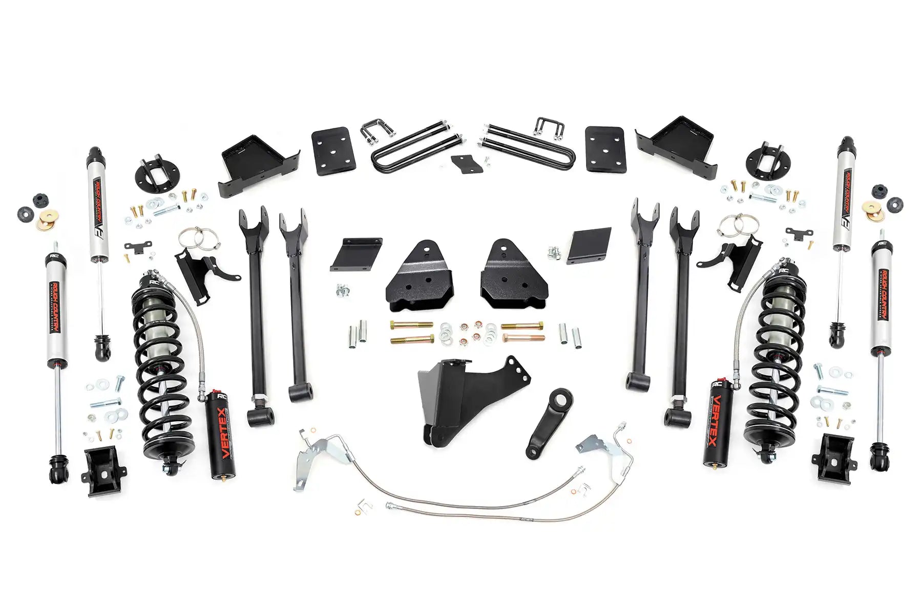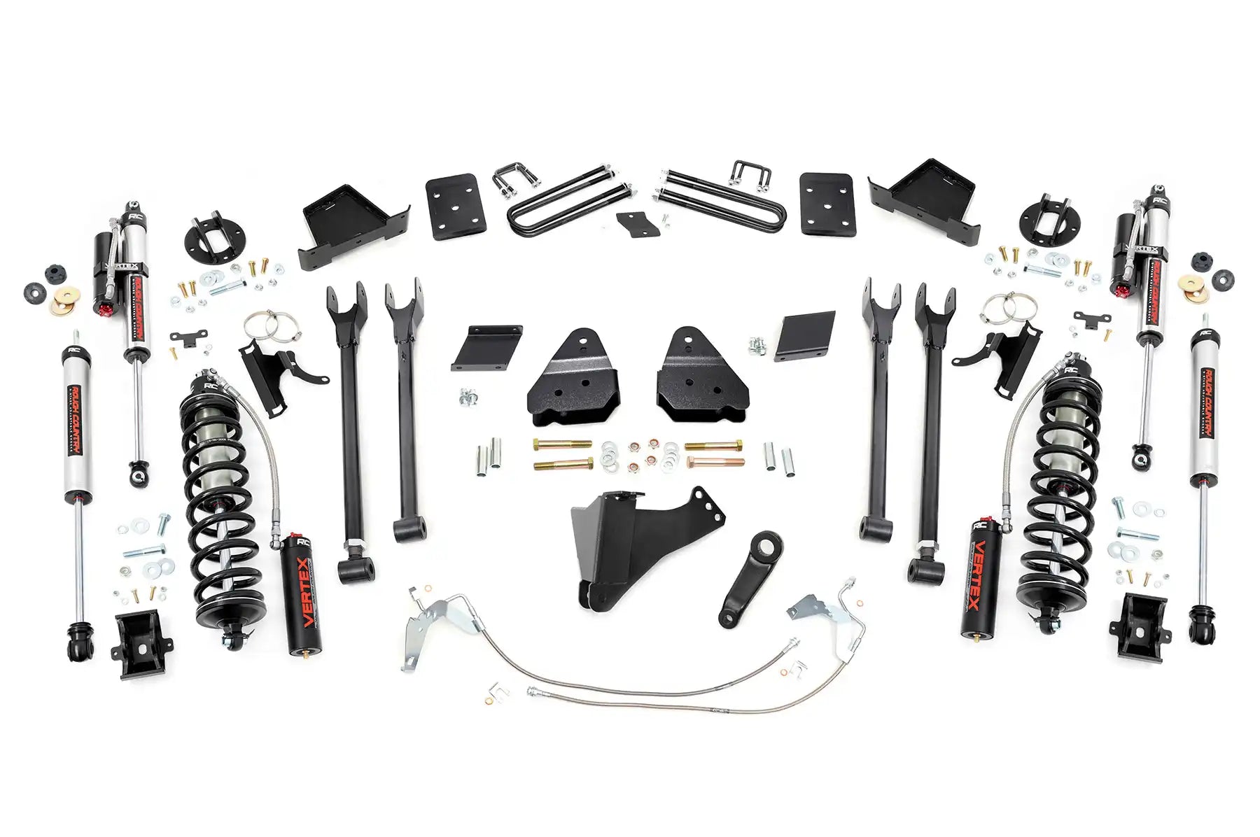 Durable Components. Rough Country’s 6" 4-Link Coilover Conversion Lift Kit features top-mounted reservoir brackets and coil-over mounts constructed from 1/4-inch steel. Utilizing this conversion kit you're removing the factory independent coil shock and coil set-up and replacing it with a massive 2.5in piston, nitrogen-charged, 8-stage adjustable Vertex Coilover. Rough Country’s Vertex Coilovers feature a monotube design with an external reservoir for increased oil capacity and damping sensitivity. When it comes to investing in a high-end kit, you’ll be pleased to find that Rough Country’s 2.5in piston design is beefier and offers an impressive 56% greater fluid capacity than the average reservoir shock. Each kit is paired with a monotube shock that provides optimal damping control.