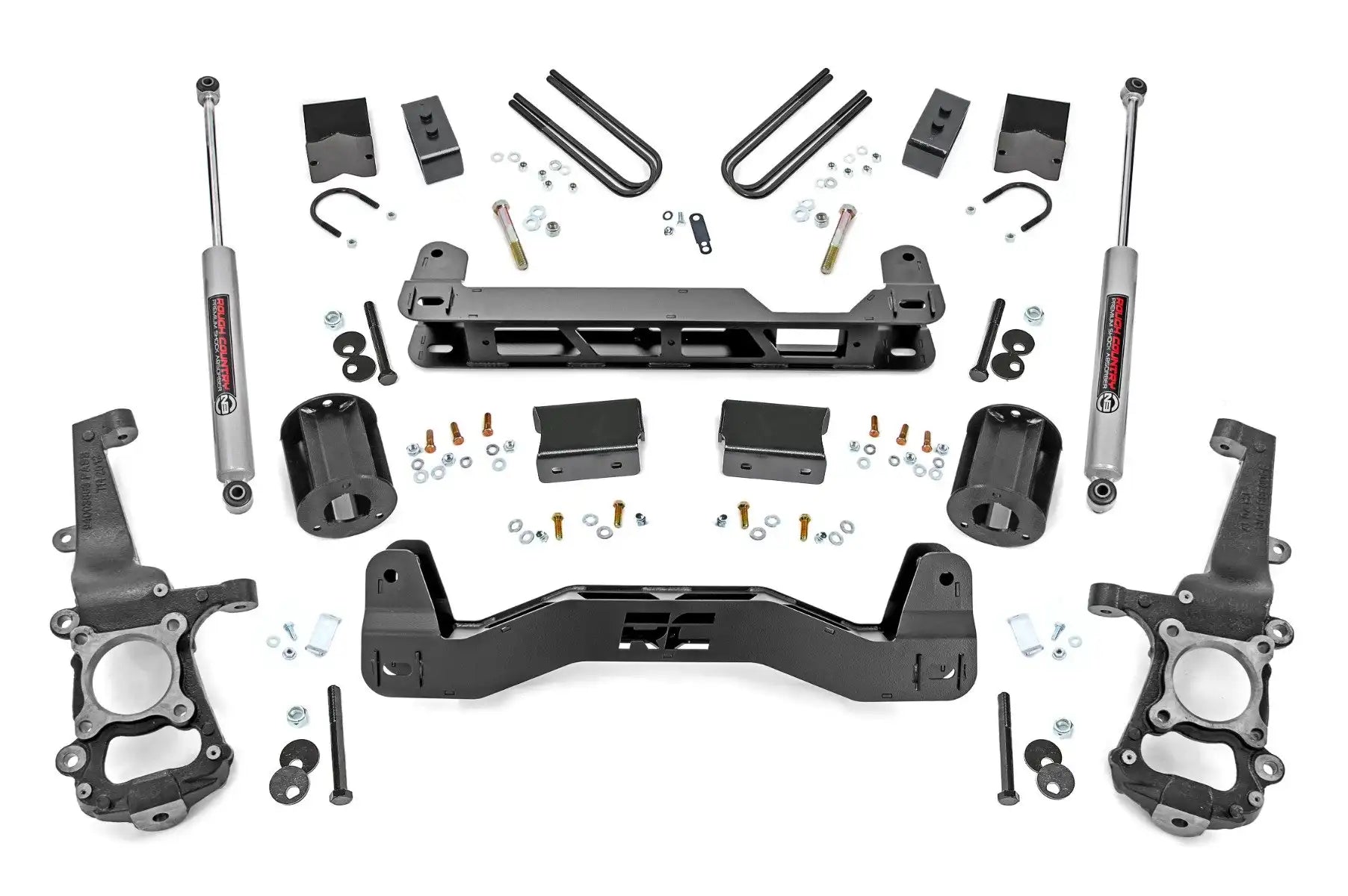 Durable Design and Function! Rough Country’s 6in Suspension Lift gives you plenty of increased ground clearance for off-road action and enough additional ride height to run up to 35in tires for a head-turning look that’s sure to command attention. Each kit features a set of high-quality front and rear cross members with a laser-cut RC logo, giving the truck a fierce, but streamlined look after lifting. Featuring a set of durable lifted knuckles and strut spacers, you'll gain enough ride height to run up to 35-inch tires with proper wheel spacing! Our Fabricated Rear Blocks offer considerably more strength than their cast iron counterparts and were specifically engineered by Rough Country to prevent against axle-wrap.