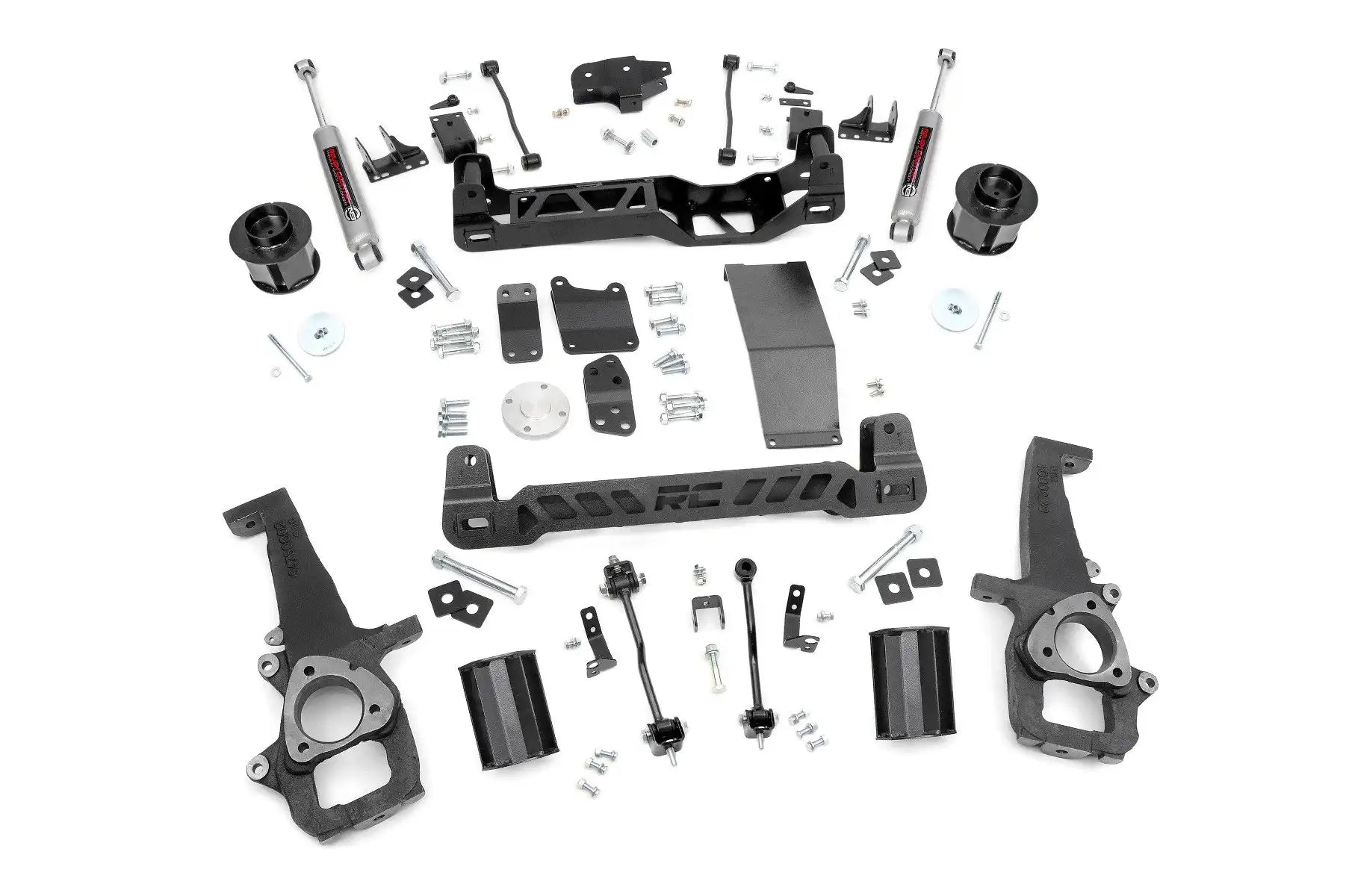 Utilizing heavy-duty, laser cut, steel equipment engineered by Rough Country, these 6-inch Suspension Lifts are complete kits that include everything needed for outstanding off-road performance. High-clearance front and rear cross-members provide enough room for off-road climbs and runs. A heavy-duty skid plate shields the vehicle’s differential, protecting you from hazardous terrain. A durable set of driver and passenger side lifted cast knuckles are also included, helping to promote proper geometry once the vehicle is lifted.