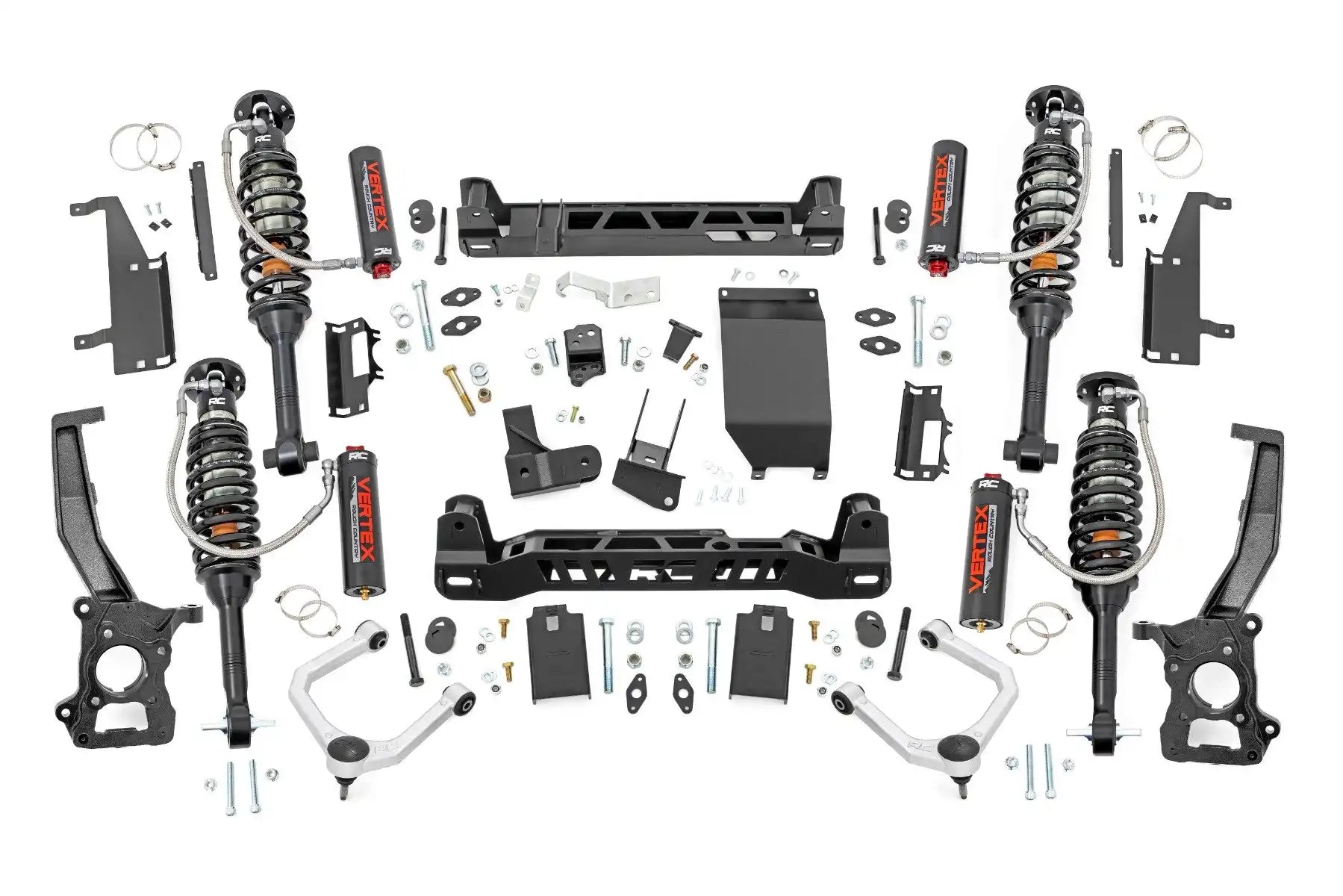 Innovative Design and Construction. This suspension kit combines the use of durable steel knuckles, forged aluminum control arms, differential brackets, and drop cross members to reduce cv angles and simulate factory angles all while achieving new heights. Featuring a set of upper strut spacers that offer uncompromised strength and rigidity, gaining lift height is no issue. Completing the rear of this suspension kit included is a rear track bar and brake line relocation brackets that allow you to retain factory-like geometry. This combined setup provides enough clearance to run 40" tires with proper wheel backspacing.
