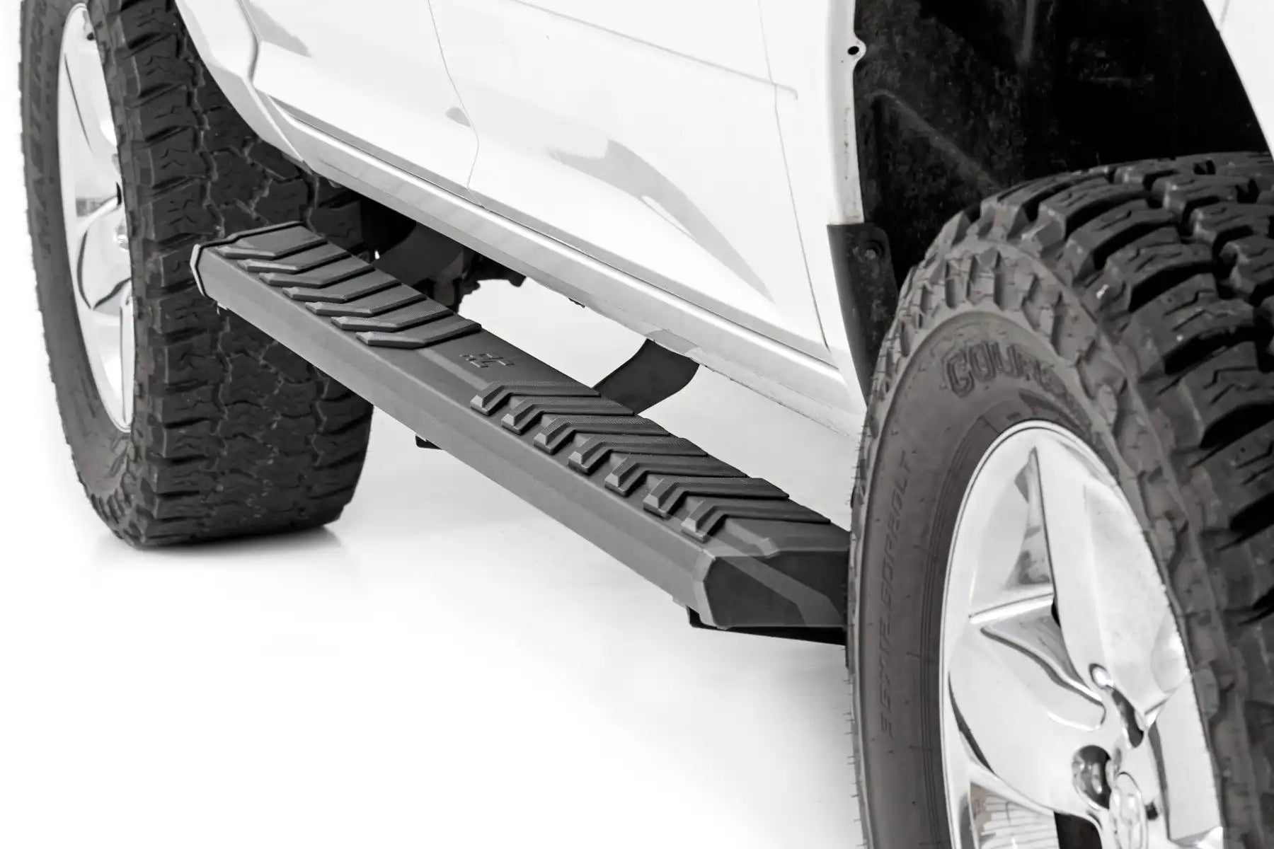 Durable Construction. Rough Country's BA2 Running Board Steps feature a comfortable, 5-inch wide stepping area with an integrated insert design that ensures foot placement when climbing in and out of your vehicle. Each running board features a durable powder-coated finish and a nonslip design that can support up to 500lbs!