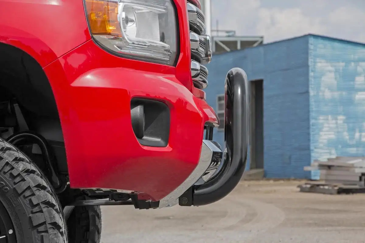 It's the ultimate combination of form and function with Rough Country's durable, new Bull Bars. Protect the front end of your truck with our beefy yet stylish Bull Bar kit. Featuring a 3-inch diameter tube design and corrosion-resistant finish, this Bull Bar package offers superior protection from hazards of the road and trail.