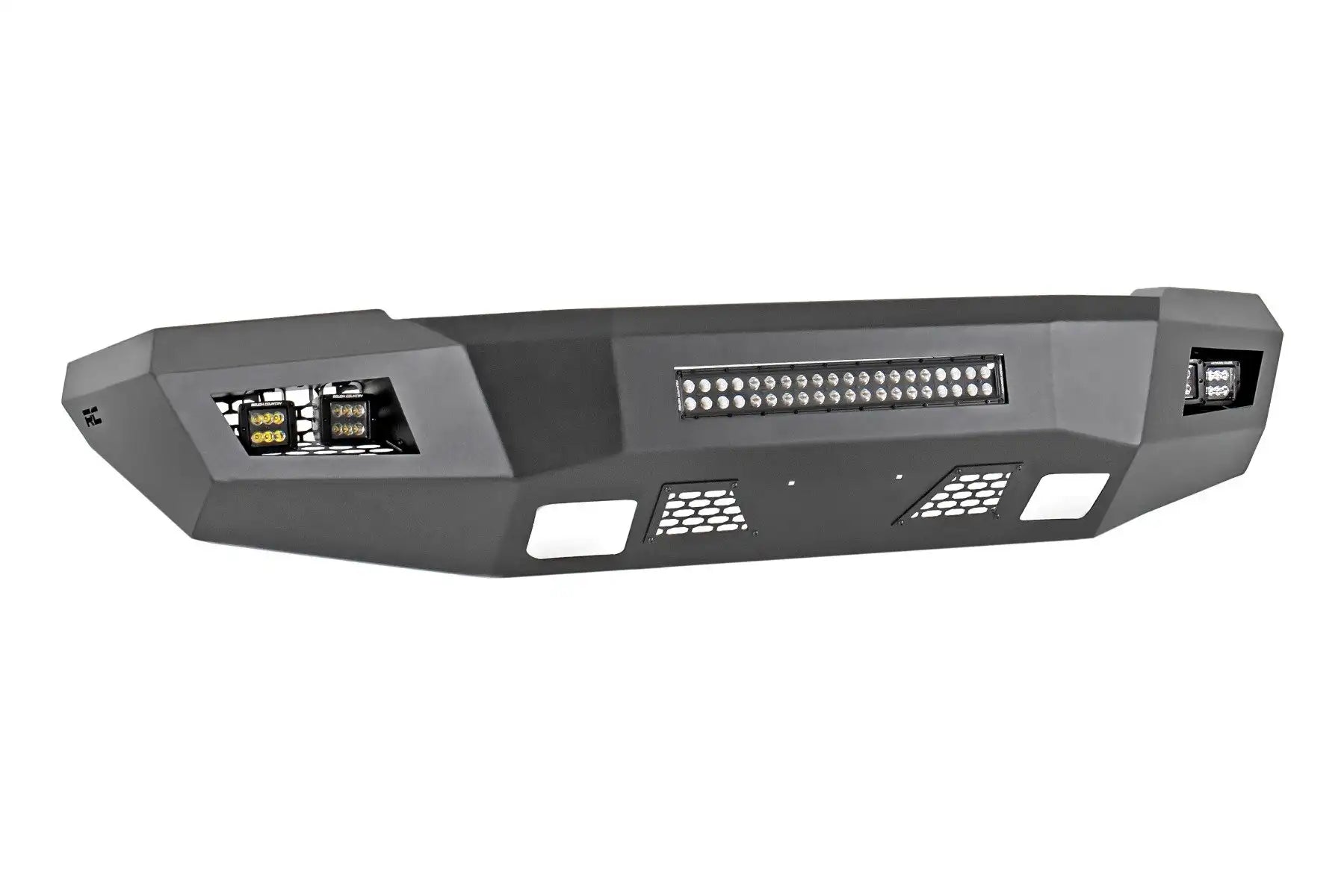 Give the front of your Chevrolet Silverado an aggressive, new appearance with Rough Country’s Front LED Bumper. This easy-to-install upgrade gives your truck an improved look and better protection that offer impressive off-road illumination! Rough Country’s Front LED Bumper is made of a durable, all-steel construction. Each bumper features four Rough Country 2in LED Cubes and a 20in LED Light Bar that offer over 15,000 lumens of combined lighting power. Each bumper also includes sensor relocators to allow you to retain the vehicle’s anti-collision system. This incredible front bumper system is powder coated flat black and is ready to withstand the elements for a long lifespan of good looks. Rough Country’s Front LED Bumper is also easy to install with no cutting or drilling required! Complete the look with Rough Country’s Rear LED Bumper for a total transformation of your truck.