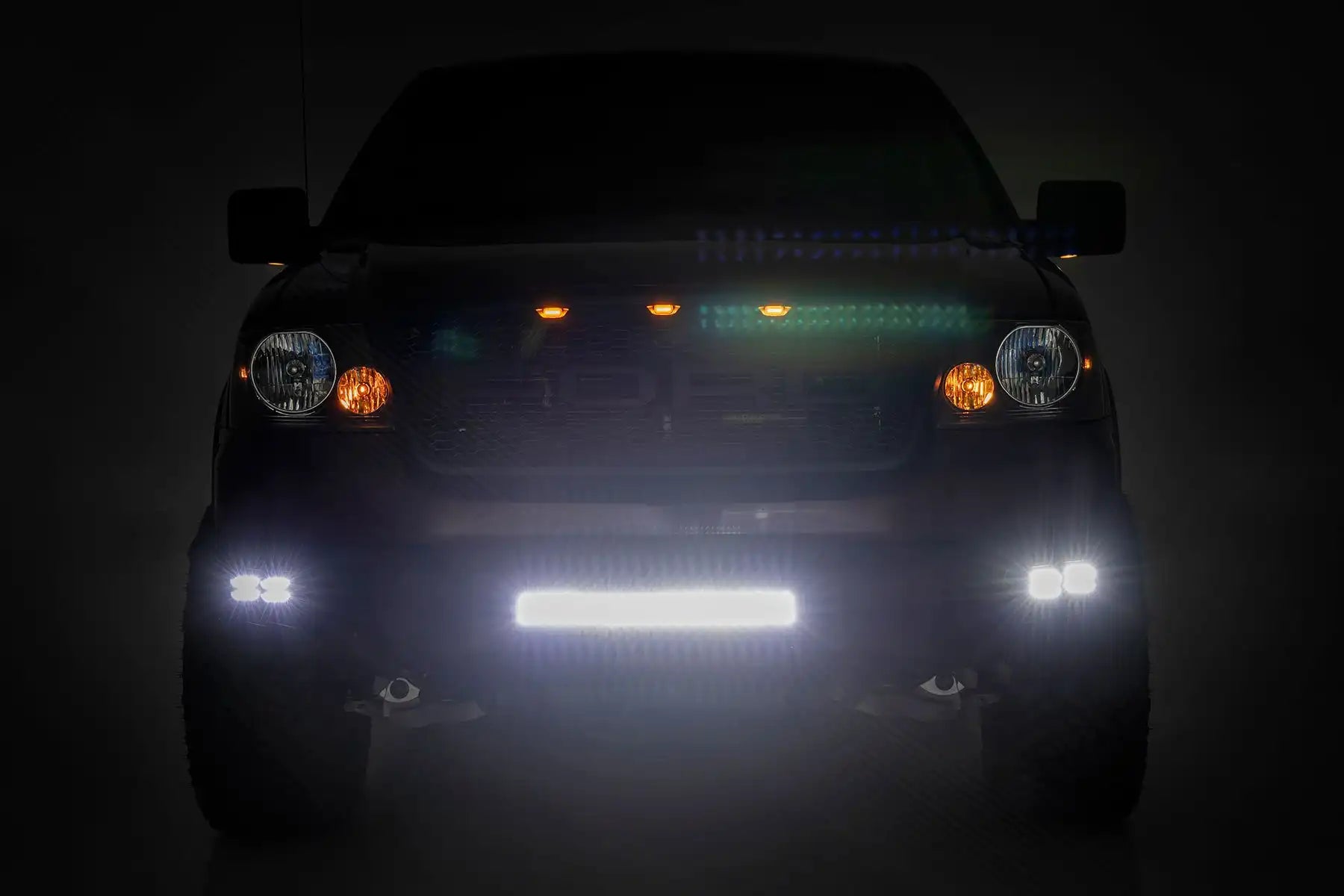 With the Front LED Bumper from Rough Country, your F-150 will have an aggressive, fresh appearance. With a dual pair of 2in LED Cubes and a 20-inch LED Light Bar that provide amazing off-road illumination, this simple improvement gives your truck a better look and better protection!
