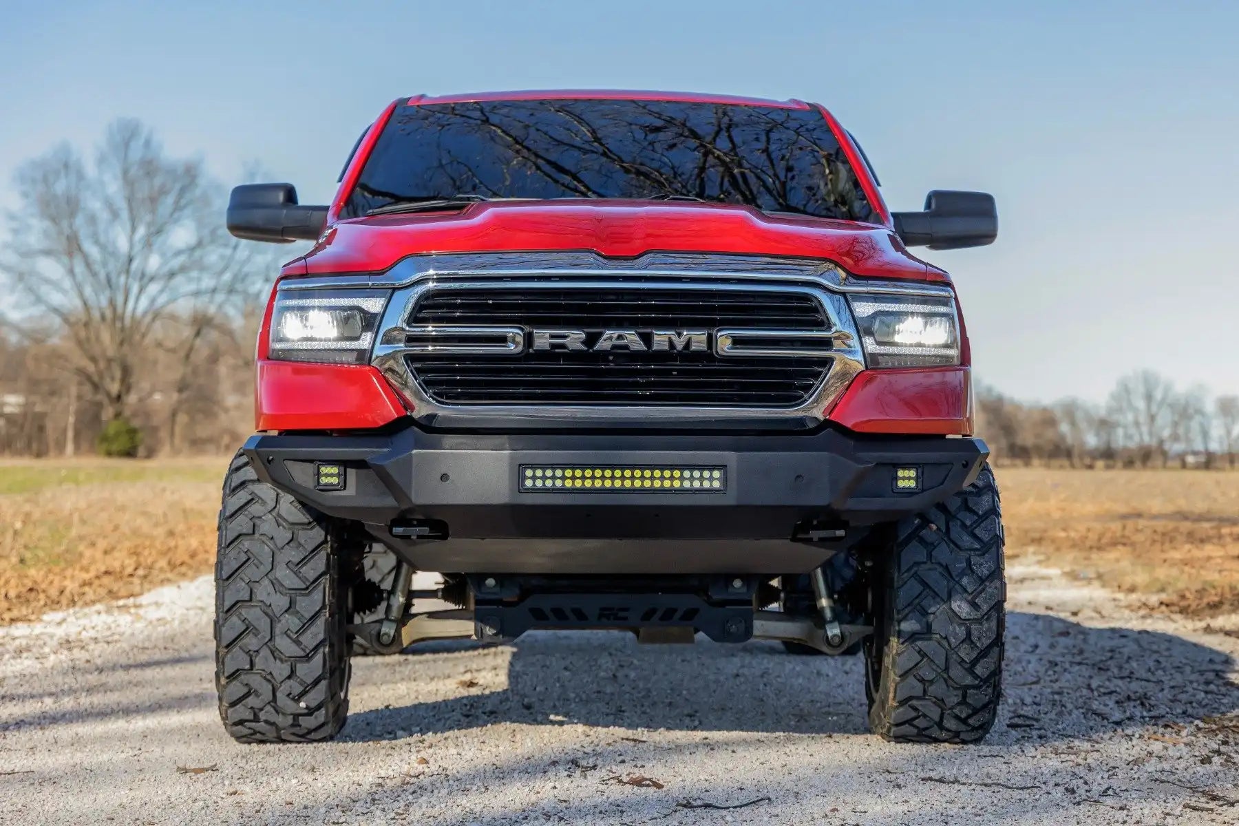 Aggressive Appearance. The Front High Clearance LED Bumper from Rough Country will give your Ram 1500's front end an aggressive, modern appearance. With a set of 2-inch LED Cubes and a 20-inch LED Light Bar that provides amazing off-road illumination, this simple improvement gives your truck a better look and better protection!