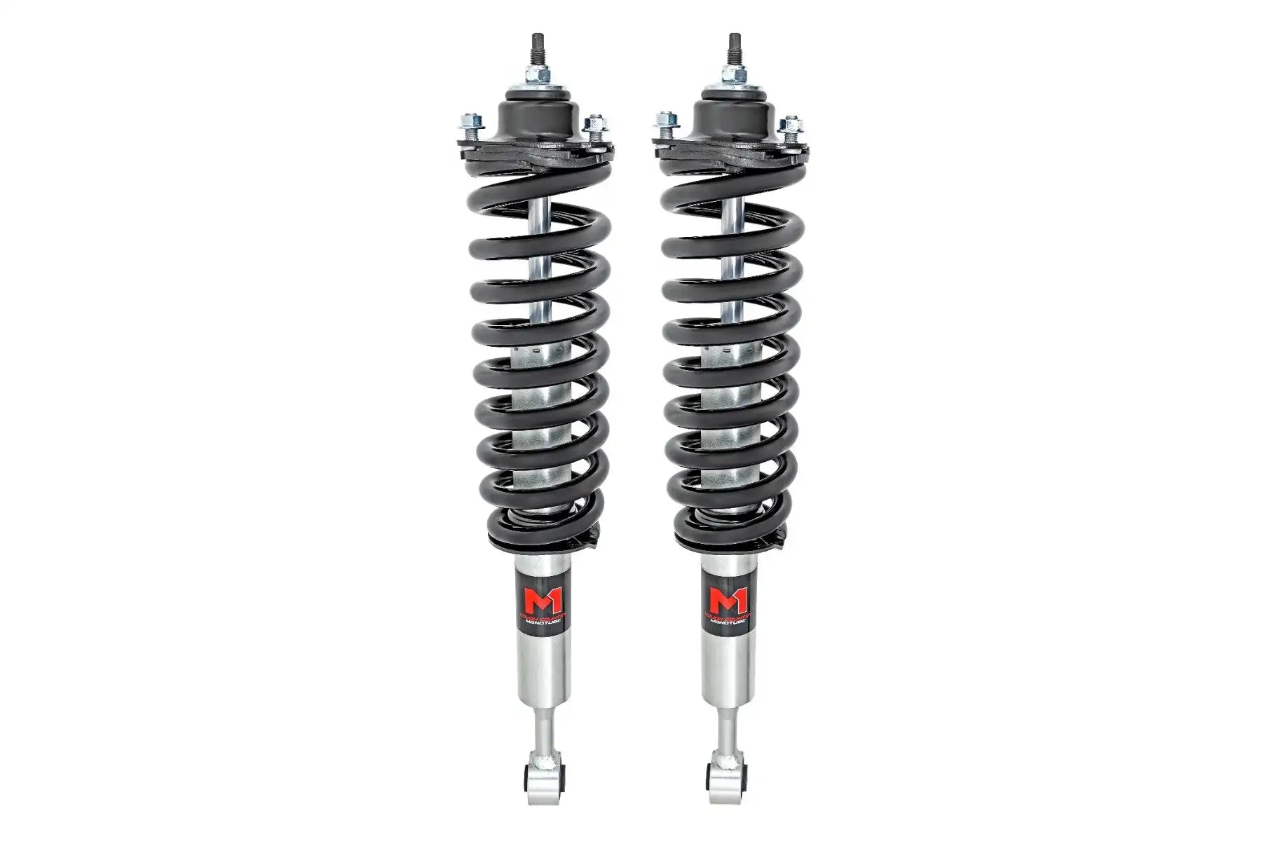 Improved Handling, Balance, and Stance. Rough Country's M1 Loaded Strut Kits are the way to go if you want to enhance your car's on- and off-road performance. Our M1 Loaded Struts contribute to the stabilization of your vehicle's motions, improving control during turns, braking, acceleration, or riding over irregular road surfaces. These M1 struts, which have an adjustable ride height, prevent your suspension from expanding too much, giving you a smoother ride. Our M1 monotube struts, designed for tough off-road performance, with a 46mm progressive piston for a more stable ride while maintaining the necessary smooth ride quality.